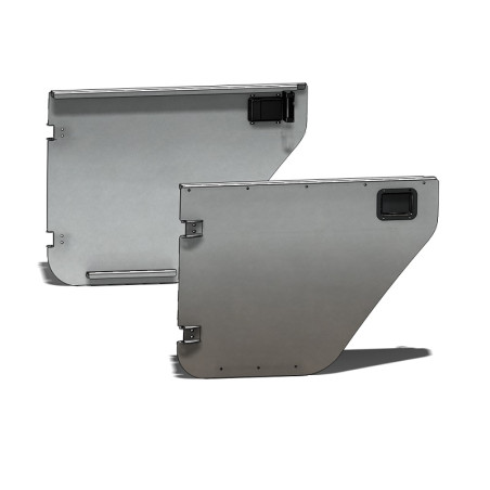 These doors are fabricated from high-strength 1/8" 5052-H32 aluminum. This alloy has an ultimate tensile strength of 32,000 psi. The doors are CNC laser cut and formed with high-precision forming machines to create a beautiful finished product. The door panel is rolled to the radius of the JL tub for a nice body line at the perimeter. We include latches and all hardware require to install the doors. Please call us for more information!